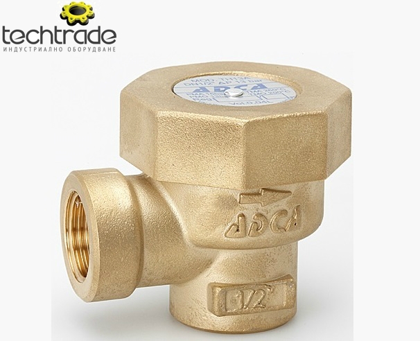 Термостатично кондензно гърне, модел TH13A, с филтър, на резба, месинг, производител Valsteam ADCA, тяло - месинг EN12165/CuZn39Pb2, капак - месинг EN12165/CuZn39Pb2, седло - неръждаема стомана AISI 304 (1.4301), термостатичен елемент - неръждаема стомана, филтър - неръждаема стомана - AISI 304 (1.4301), уплътнение - неръждаема стомана/графит, максимално работно налягане - 13 bar, максимална работна температура 200˚ C, размери 1/2"